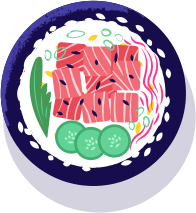 Poke is a raw fish salad traditional to Hawaii. Typically served in a bowl, it is usually comprised of rice layered up with raw (or lightly smoked) fish and fresh veggies – but can be customised to include any combination of fruit, pickles, garnish… you name it!