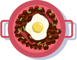 Sisig is a traditional Filipino dish made from pig's head (face, ears, cheeks & snout) and liver, seasoned with vinegar, ‘calamansi' juice and chopped onions. The meat is boiled and then grilled and fried until crispy and served with an egg on top, alongside garlic rice.
